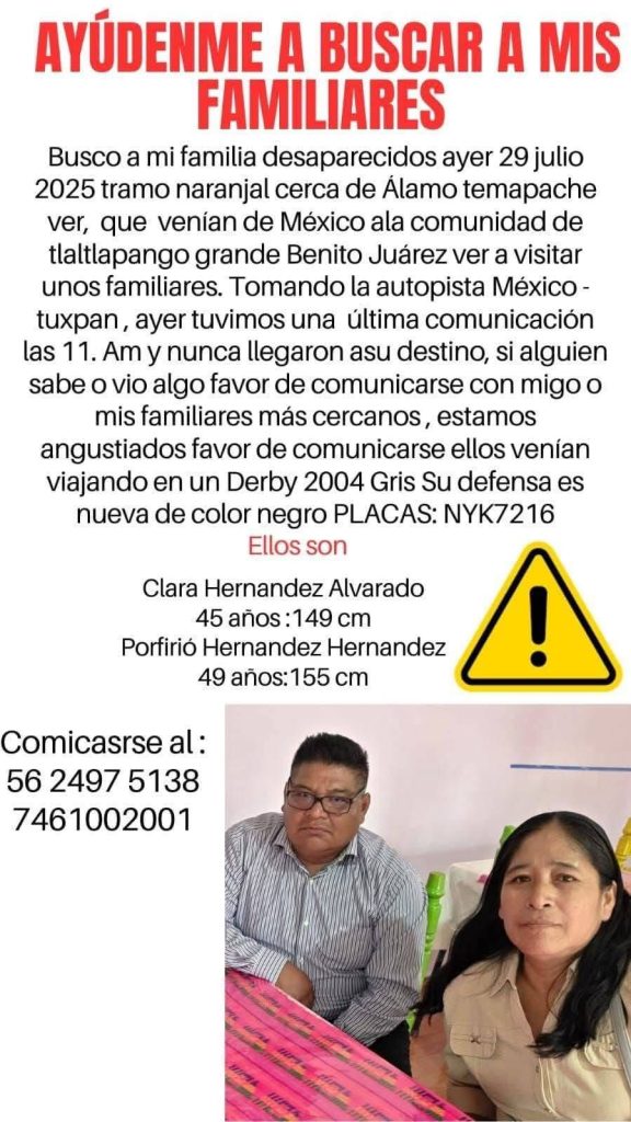 La pareja fue vista por última vez el 29 de julio que tomaron la autopista México-Tuxpan para visitar a unos familiares en la comunidad de Tlatlapango Grande, en Benito Juárez, estado de Veracruz.Nunca llegaron a su destino y se desconocía su paradero hasta este domingo.