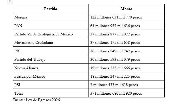 De acuerdo a la Ley de Egresos, este 2026 los nueve partidos políticos de Puebla obtendrán 371 millones 680 mil 920 pesos, los cuales, serán administrados en pagos mensuales. El partido que más dinero recibirá es Morena, con 122 millones 631 mil 770 pesos.
