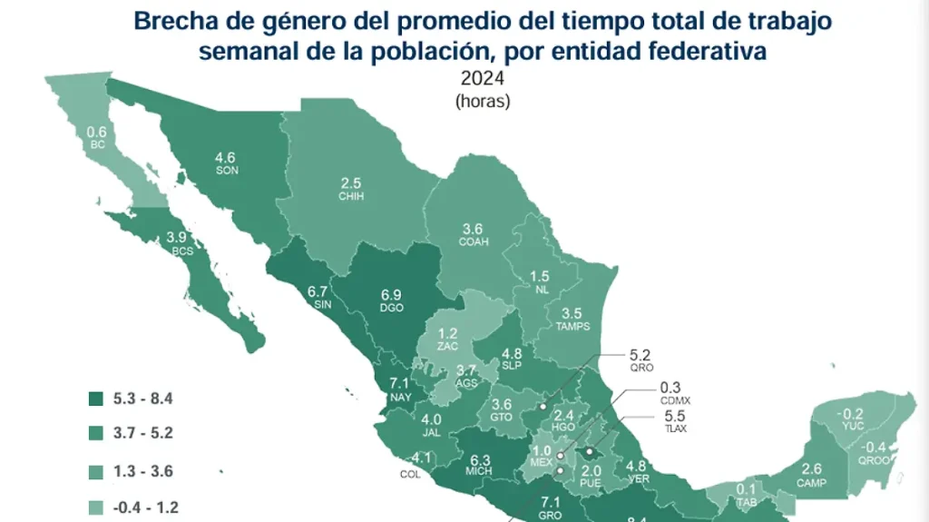 A nivel nacional, la diferencia se traduce en que por cada hora que las mujeres invierten en actividades del hogar, los hombres apenas dedican 25 minutos. En el caso de Tlaxcala, la brecha de género en el tiempo total de trabajo alcanza 5.5 horas semanales, una de las más amplias del país, solo por debajo de Oaxaca, donde las mujeres trabajan 8.4 horas más que los hombres en este tipo de actividades.
